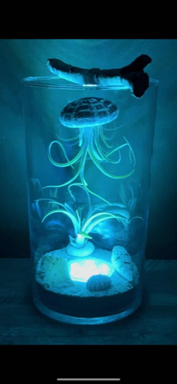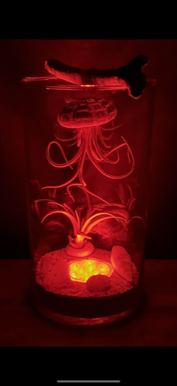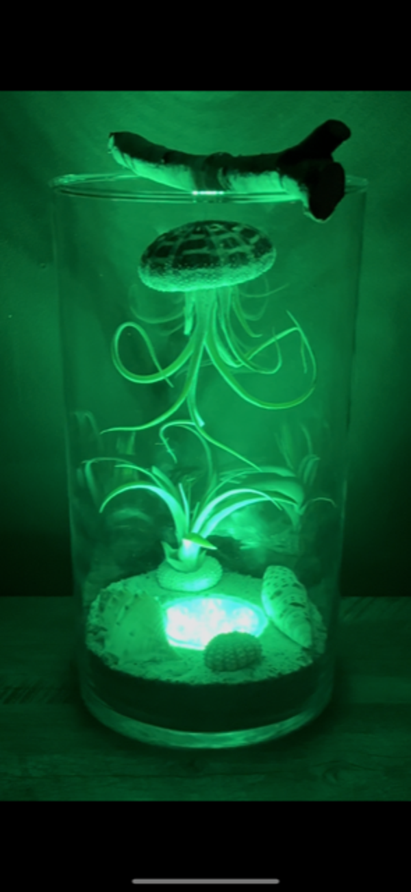 Schöne Glasvase mit einer Landschaft aus Luftpflanzen.